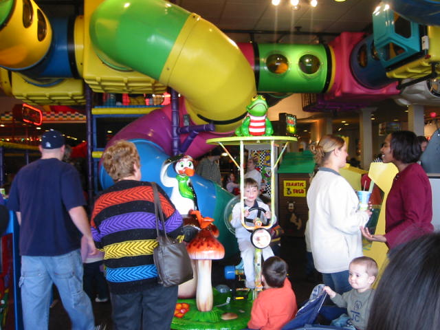 両脇からがっちりと支えてあげても嫌がって大騒ぎ。転ぶ心配はないのに、トライしようとせずにペタリと座りこむ。「魚釣りゲーム」コーナーや滑り台ではなかなか