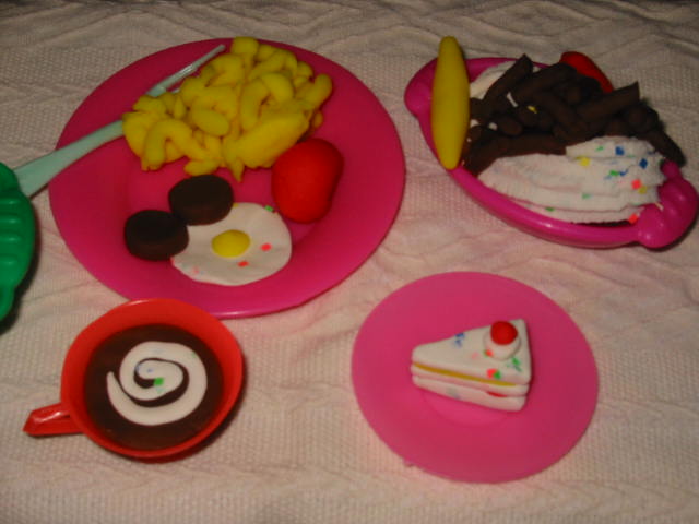 ひととおりソフトクリームをつくってしまうと同じ事の繰り返しに退屈し始めていたのだが、しばらく一緒にPlay-Dohをいじっているうちに、おままごとセットも使ってフルコースを作る事を思いついた。